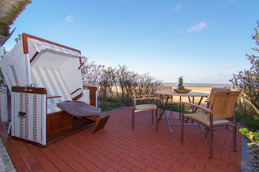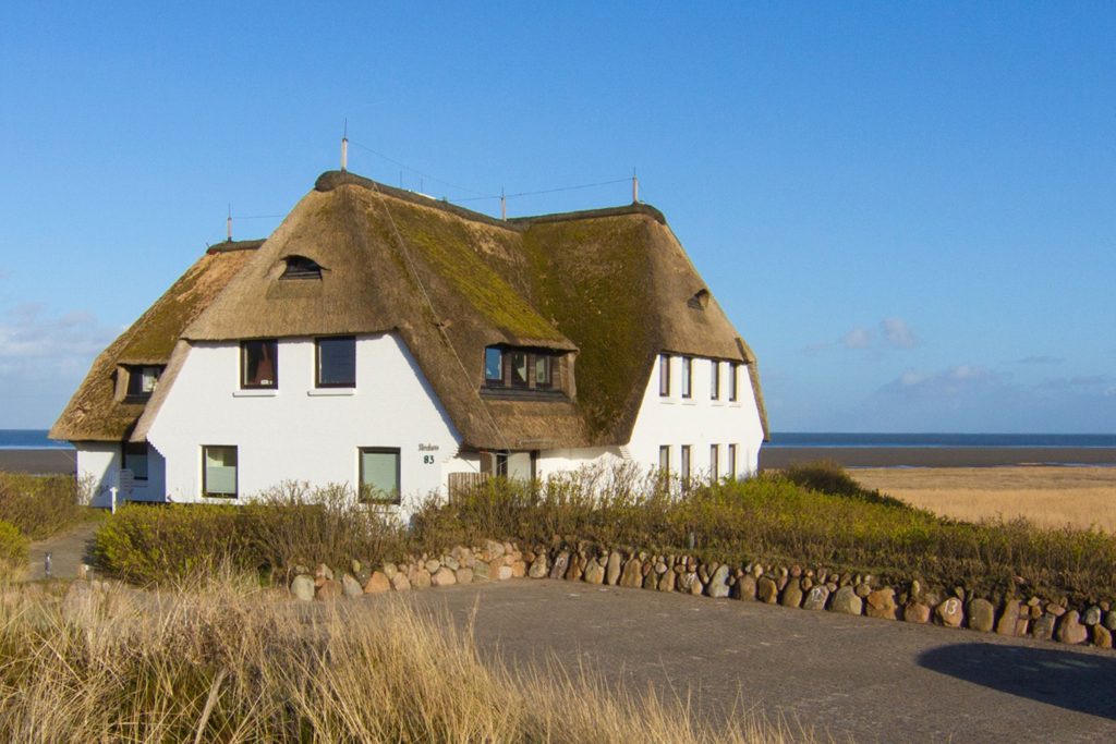 Dieses reetgedeckte Haus liegt am Ende einer Sackgasse direkt am Wattenmeer in Rantum auf Sylt. Sie schauen von der Wohnung aus über ein weitgehend naturbelassenes Grundstück auf das Wattenmeer.