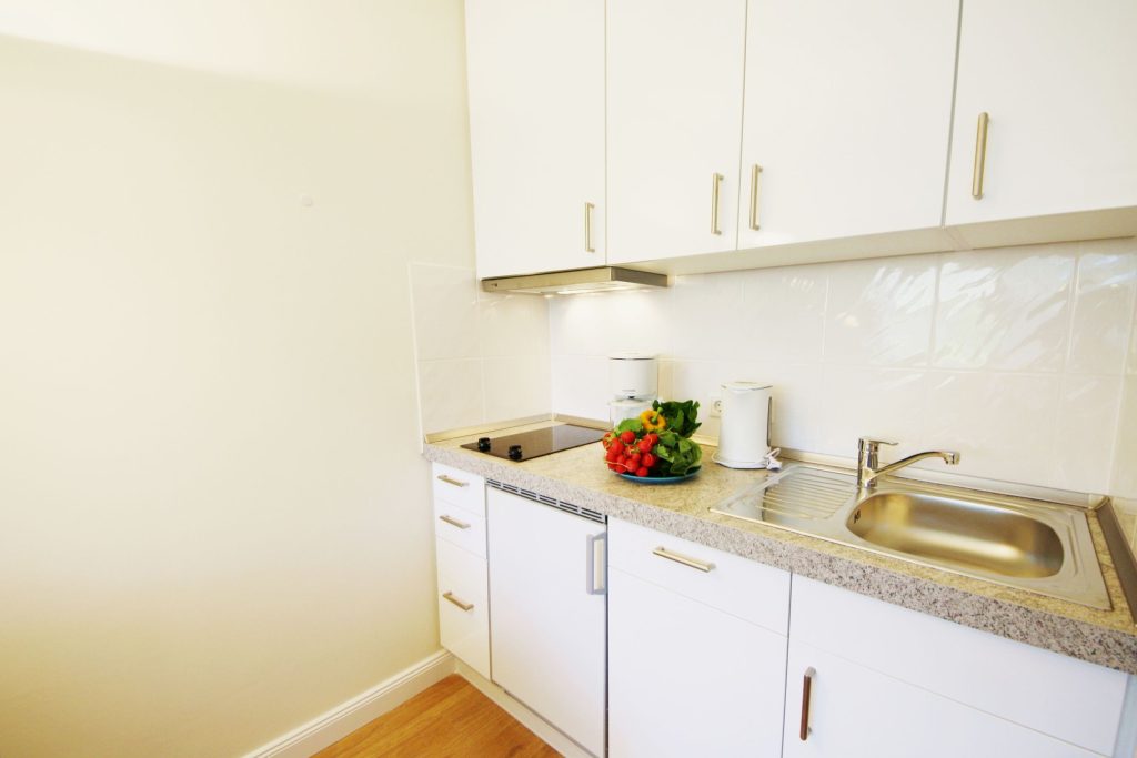 Die offene Küchenzeile ist funktional und gut ausgestattet – perfekt für die Zubereitung kleinerer Mahlzeiten oder Snacks zwischendurch. Sie verfügt über alle wichtigen Geräte, darunter Herd, Kühlschrank, Kaffeemaschine, Toaster und ausreichend Kochutensilien.