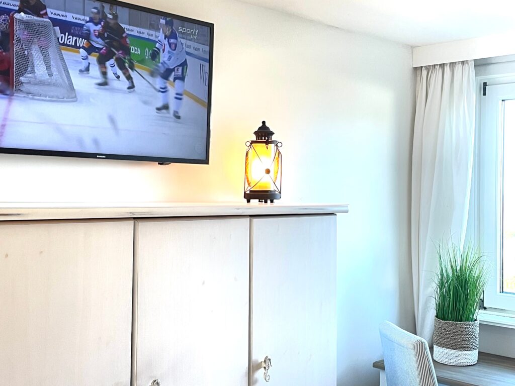 Der helle Wohnbereich lädt mit einer komfortablen Sitzecke und TV zu entspannten Stunden nach einem Strandspaziergang ein. Große Fenster sorgen für viel Tageslicht und eröffnen einen schönen Blick in die umliegende Dünenlandschaft.