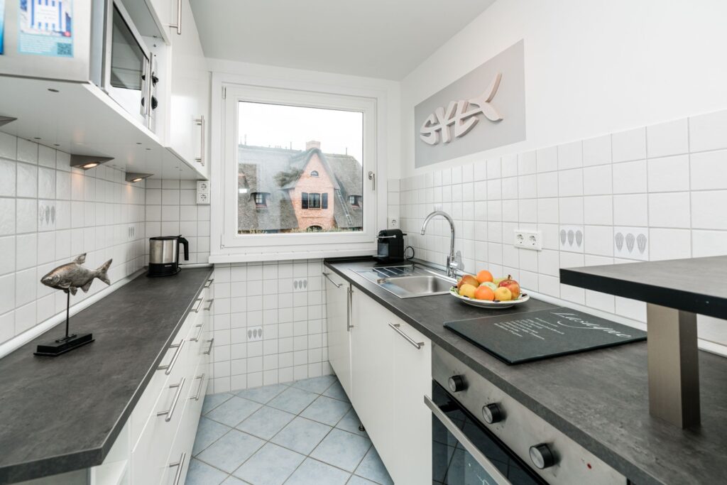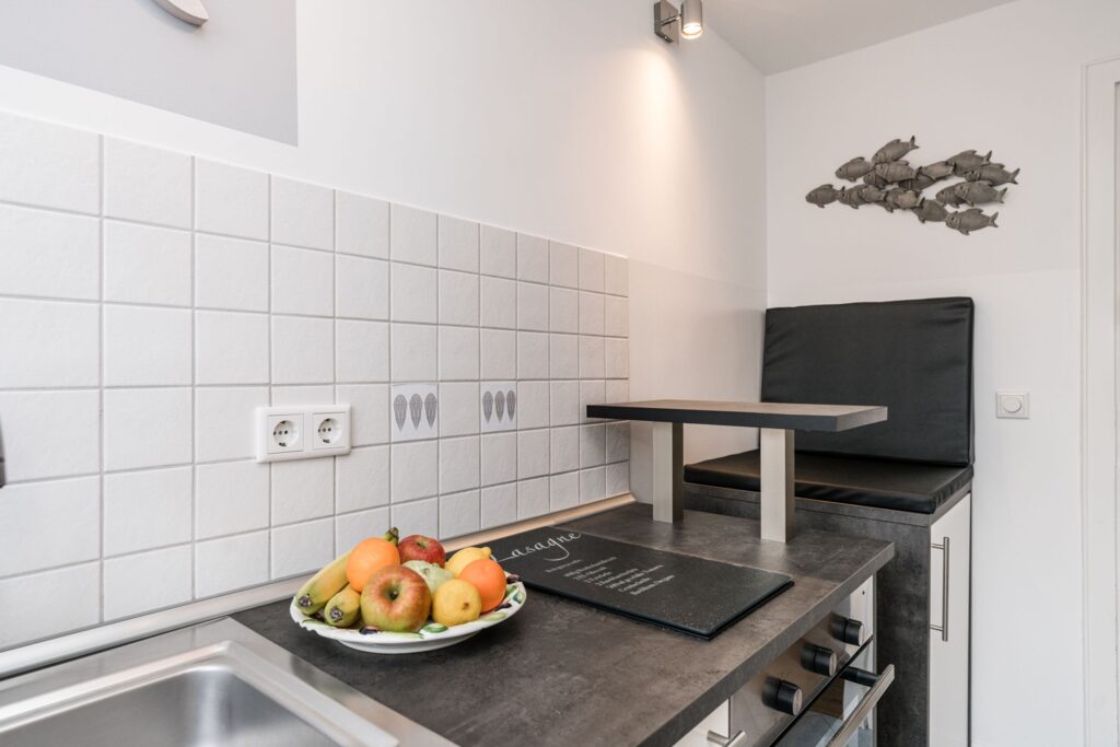 Die separate, voll ausgestattete Küche bietet ausreichend Platz und alle wichtigen Geräte, sodass Sie Ihre Mahlzeiten ganz flexibel im Urlaub zubereiten können – ob ein entspanntes Frühstück am Morgen oder ein gemeinsames Abendessen nach einem erlebnisreichen Tag auf der Insel.