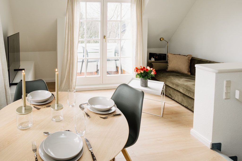 Die moderne Wohnung verfügt über einen lichtdurchfluteten Wohnraum mit bequemen Sofa und TV. Angrenzend befindet sich der großzügige Essplatz, sowie die kleine Küchenzeile mit einem 2-Platten-Herd, Geschirrspüler, Kaffeemaschine, Wasserkocher und Toaster. WLAN vorhanden (ohne Gewähr)